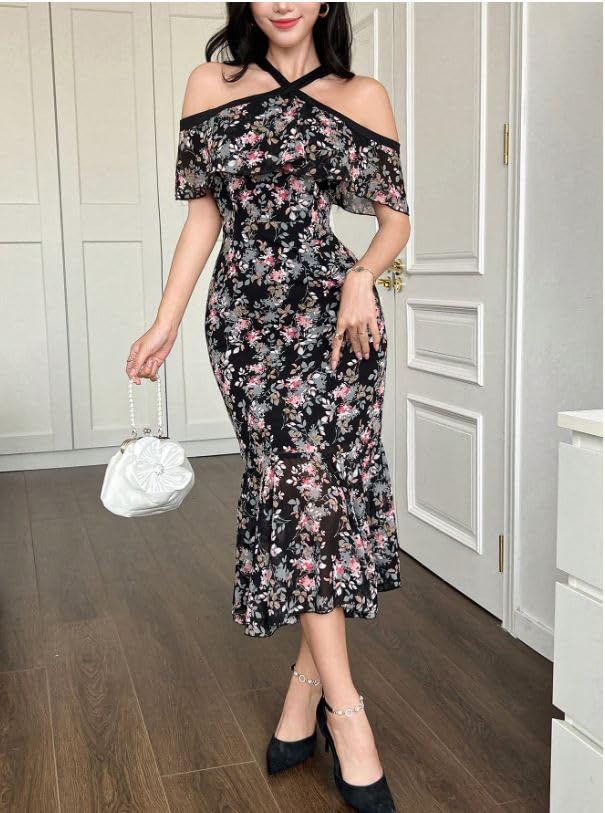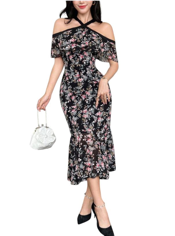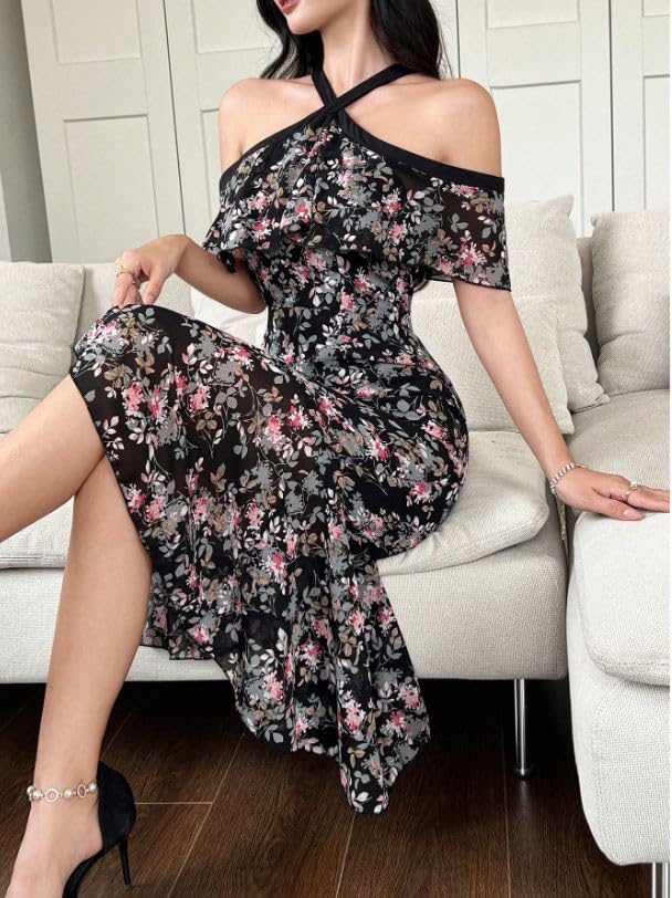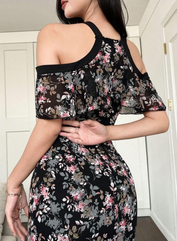 Generic - Floral Cold Shoulder Midi Lingerie Dress, Black with Pink Flowers, Ruffle Detail