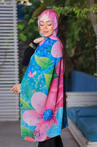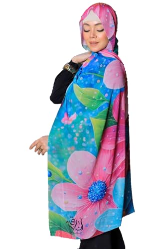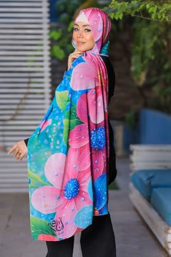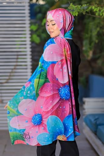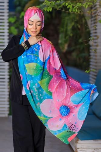 Anaqah Scarf - سكارف حجاب شيفون بطبعة زهور، 200 × 75 سم، نمط زهور بينك وازرق