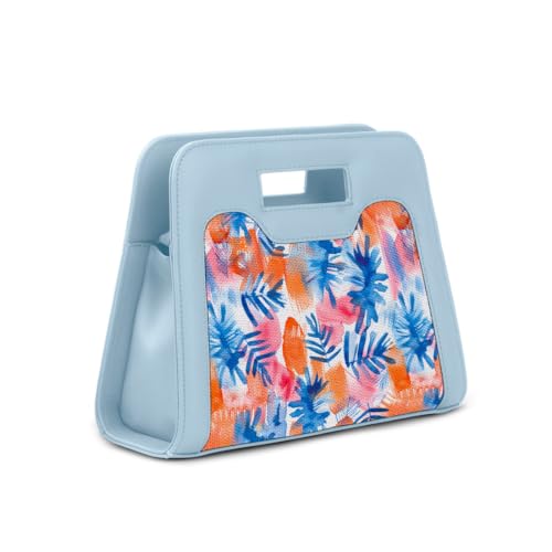 Generic - Floral Print Handbag with Cut-Out Handle, Blue Leather Trim, Orange and Blue Pattern