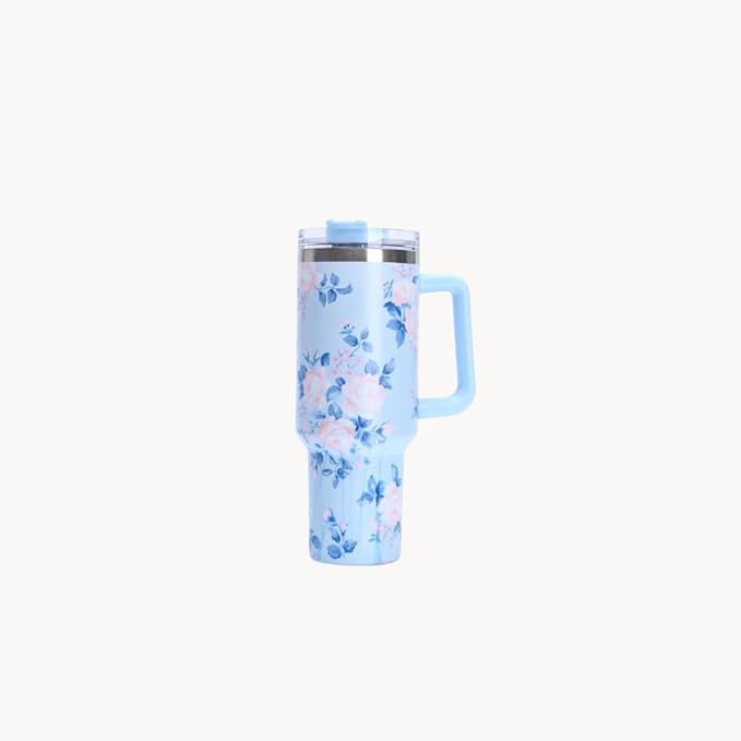 - DESIGN FEATURES: Light blue insulated tumbler with elegant pink and blue floral pattern, featuring a convenient handle for comfortable grip
