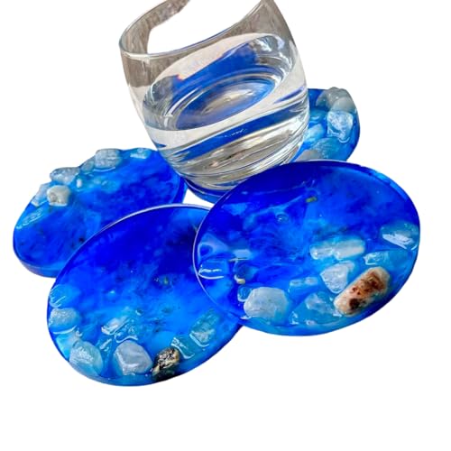 Generic - FLOW - Rocky Sea Coaster Set, Epoxy Resin and Natural Rocks, Round, Multi-Color (Dark Brown, Off White, Peach, Yellow, White, Red, Blue), 10 cm (3, Blue)