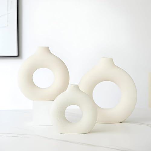 - This wonderful set of three porcelain vases has a unique matte fabric and an amazing hollow donut design. Their color and geometric beauty bring a modern European and Bohemian flavor to your home decor, making it an amazing addition to any room, whether it's living space, bedroom or office.
