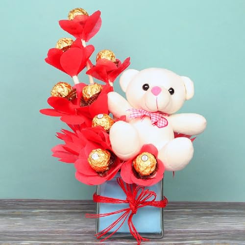 - This token features an adorable teddy bear and 8 Ferrero Rochers, each cradled in delicate red paper petals and arranged in a glass vase. This isn't your average bouquet; it's an artistic masterpiece. The vibrant red blooms contrast beautifully with the golden sheen of the chocolates. It's a visual feast that's sure to captivate the eye and tempt the taste buds.