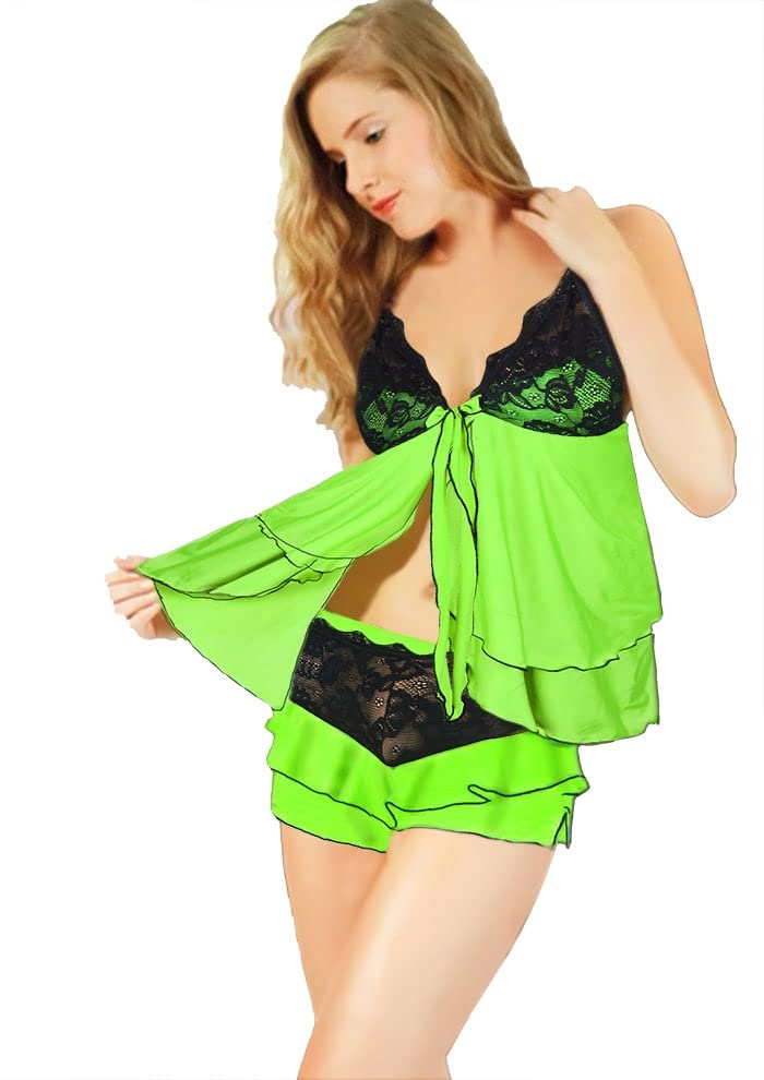 Generic - لانجيري للنساء بتصميم دانتيل عند الاطراف ولون اخضر فلوري واسود