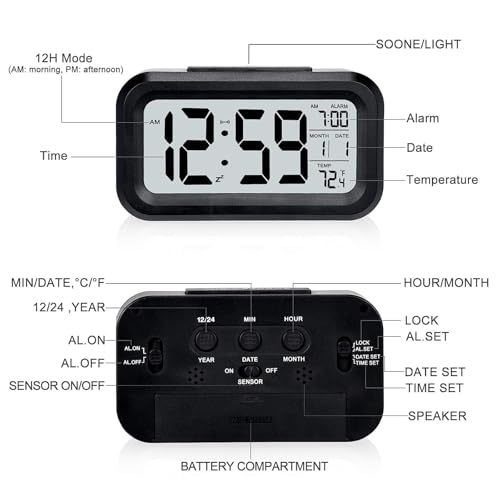 - 🌞【سهلة الاستخدام】ساعة منبه رقمية سهلة الاستخدام، مع مستشعر تلقائي لدرجة الحرارة وأربعة أزرار فقط في الخلف، لذلك حتى كبار السن أو الأولاد والبنات يمكنهم استخدامها بسهولة. ساعة المنبه مزودة بزر بإضاءة خلفية في الأعلى، حتى تتمكن من رؤية الوقت في الليل بسهولة بالضغط عليها.