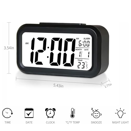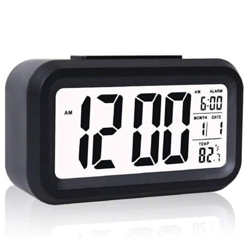Flushrenic - ساعة منبه رقمية LED تعمل بالبطارية سطوع قابل للتعديل للطلاب والمنزل والمكتب والشركات مع مستشعر تلقائي التاريخ ودرجة الحرارة أسود