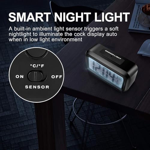 - 🌞【شاشة فائقة القوة】بفضل تصميمها البسيط وشاشة LED الأكبر، تعرض ساعة المنبه الإلكترونية التاريخ ودرجة الحرارة ويوم الأسبوع بوضوح وهي مثالية كساعة منبه للسفر.