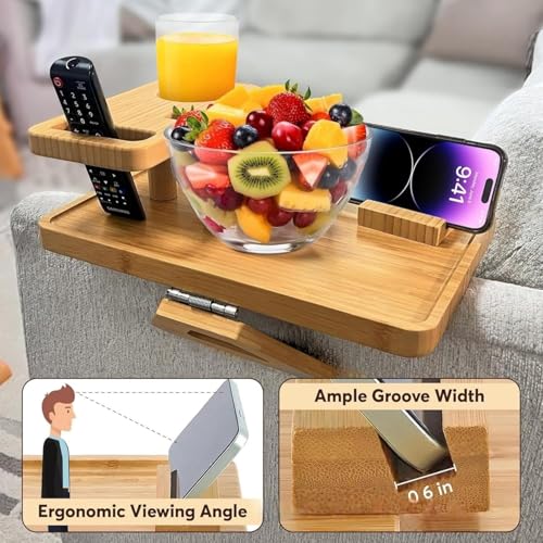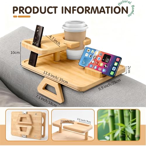 - 【High-quality Bamboo】 Sofa armrest tray is made of natural bamboo wood, which is environmentally friendly and beautiful. No odor, with unique wood grain and protective coating, waterproof and easy to clean, the sofa armrest table has rounded corners, no sharp protrusions, will not damage the sofa leather, and reduce accidental collisions.