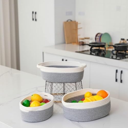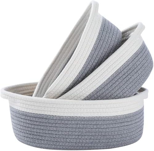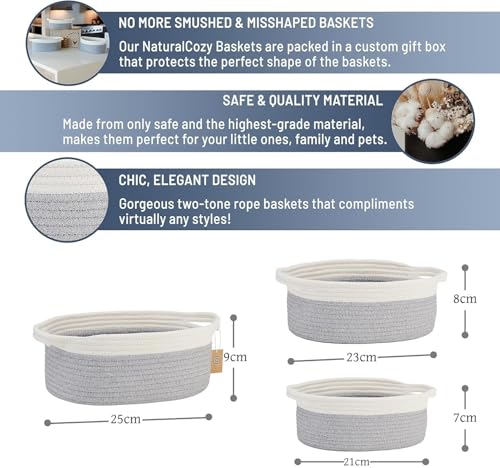 Fohome - Round Woven Baskets Set, 100% Natural Cotton Rope Woven Basket for Organizing, Set of 3, Toy Storage Basket Bin With Handles, Hand Decorative Storage Baskets for Living Room, Bathroom