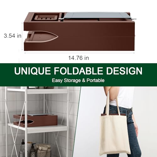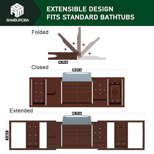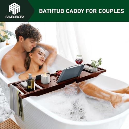 BAMBUROBA - Foldable Bamboo Bathtub Caddy Tray Expandable for Luxury Bath, Bath Accessories & Table with Wine Glass Holder, Book Stand Bathroom Organizer with Extending Sides for Men/Women,Brown