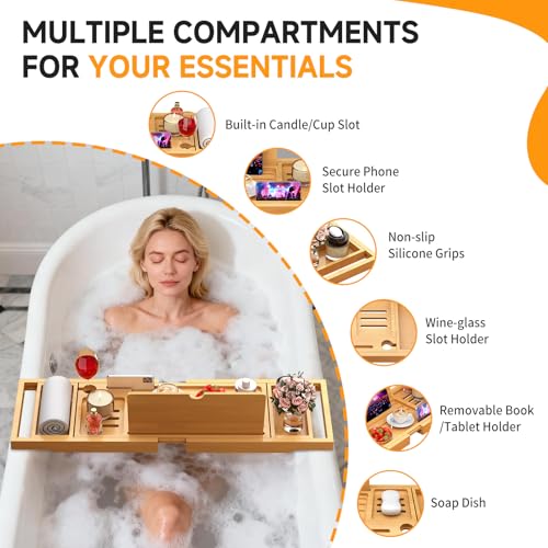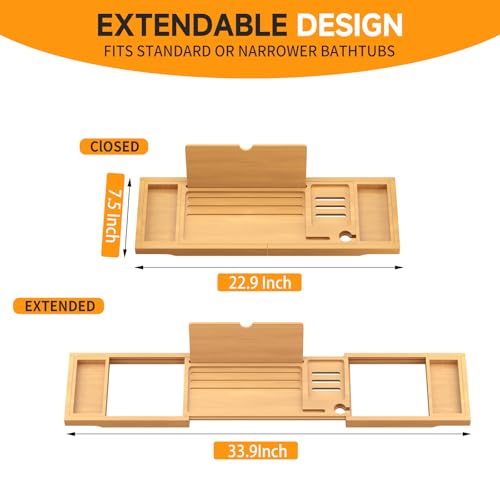 - Luxurious Home Spa Experience-What more could you want from a bath tray for bathtub? With an extendable design (Expandable from 23.62 inches/60 cm to 34.25 inches/87 cm),so it'll work with most bath sizes and widths, this bath tray table features a wine glass holder, book or tablet rest and phone holder so you don't miss any messages