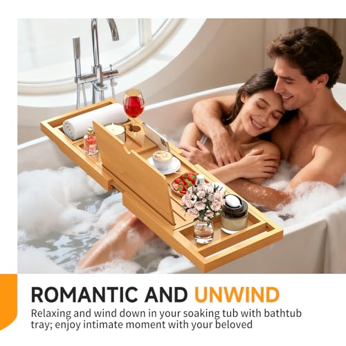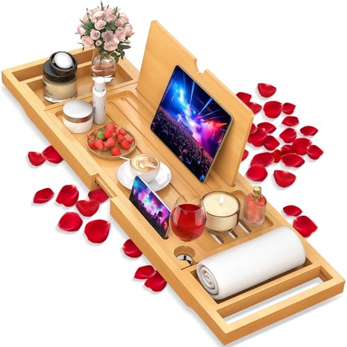 - The Perfect Present- No assembly required and easy to care. With the holiday seasons among use, our bamboo bath caddy tray for bathtub is just what you've been searching for. The bathtub tray for tub is a luxurious gift for Valentine's Day, Anniversary, Honeymoon, Thanksgiving and Christmas. Our exclusive bath rack makes for excellent couples presents for the newlyweds in your life, as well as for celebrating an anniversary or the closing of a new house