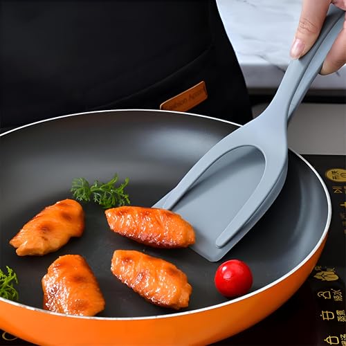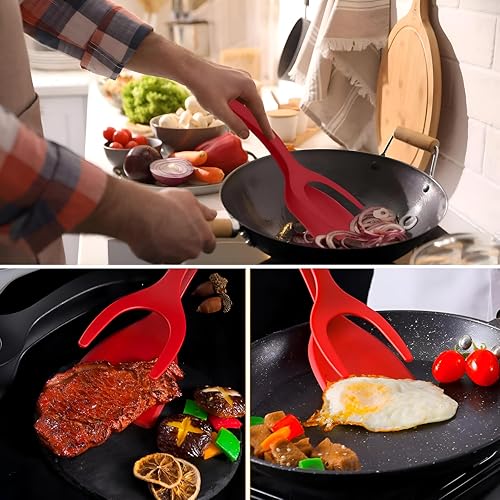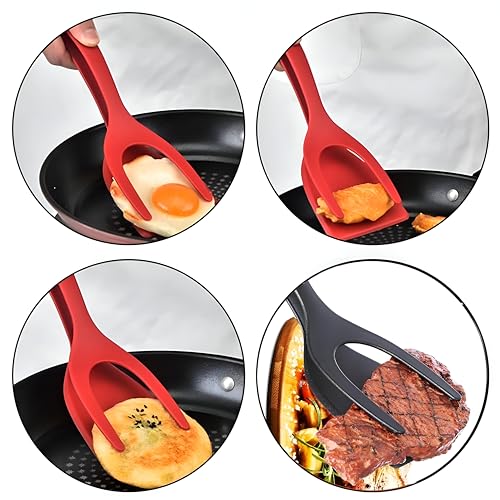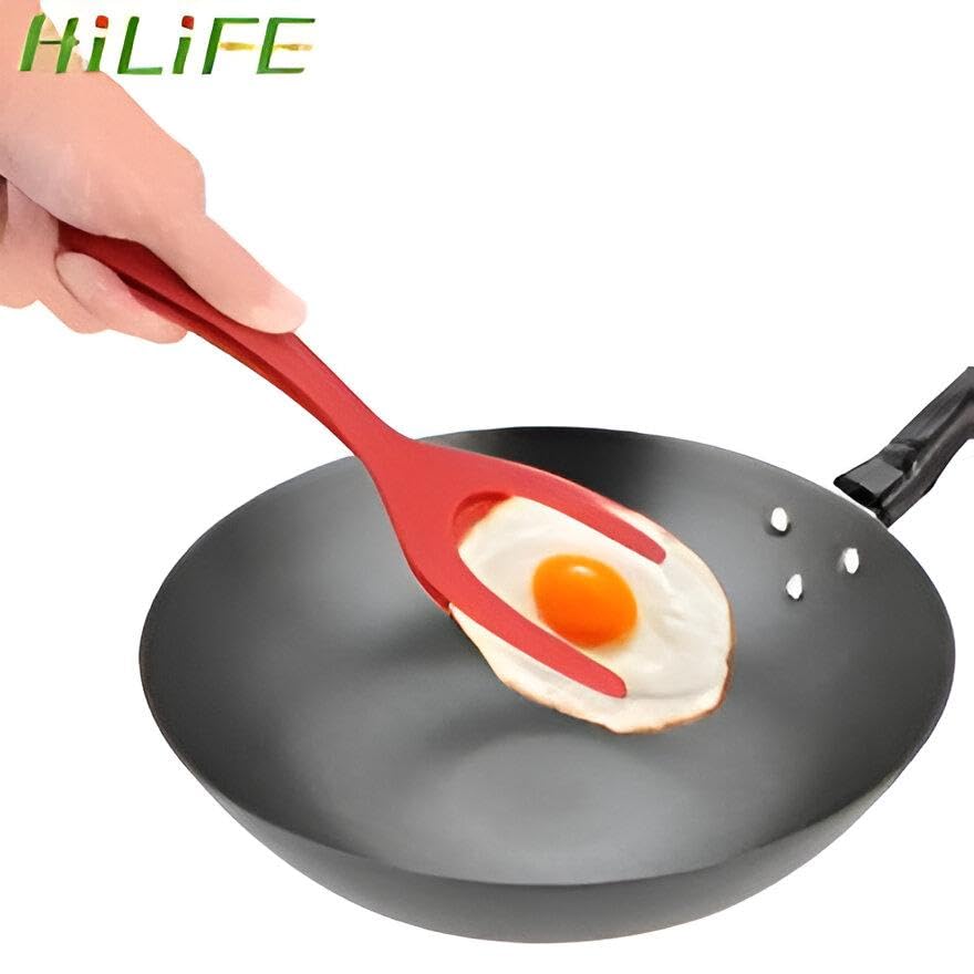- A versatile kitchen essential suitable for flipping eggs, burgers, pancakes, fish, and more. Lightweight, colorful, and adaptable, this 2-in-1 silicone spatula-tong tool adds both practicality and a touch of fun to everyday cooking.
