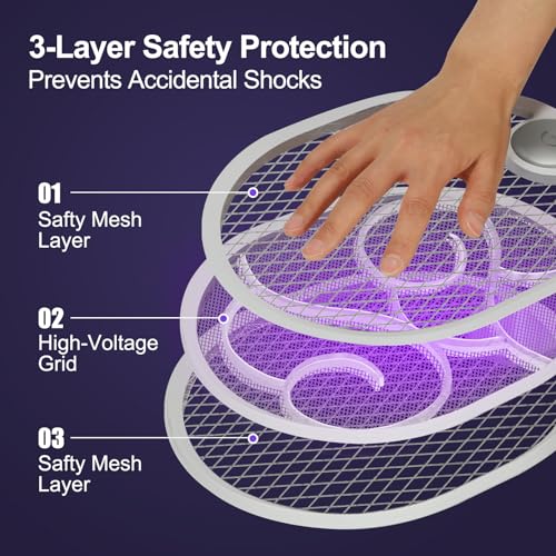 - ⛑️【Enhanced Safety Design】Featuring Dual Mesh Protection and a Double Switch, this fly killer is designed to prevent accidental shocks, making it safe for use around children and pets.