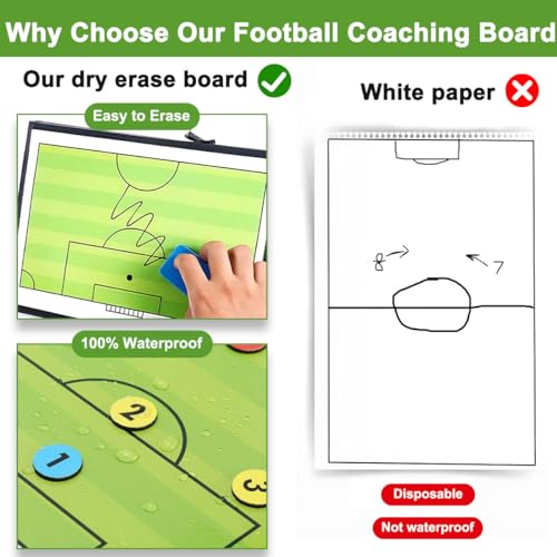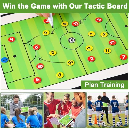 - [قم بتنظيم استراتيجية فريقك] تساعد هذه الحافظة المغناطيسية لمدرب كرة القدم على تصور الأفكار والتكتيكات حتى تتمكن من التخطيط للمستقبل واتخاذ قرارات أفضل أثناء اللعبة. لوح تكتيكات كرة القدم هذا هو أداة رائعة لتطوير استراتيجيات التدريب قبل كل مباراة للحفاظ على لاعبيك في الطابور. وفي الوقت نفسه، تنظم الحافظة لمدربي كرة القدم دورات تدريبية لفريقك، وتوفر مساعدات بصرية واضحة للاعبي وموظفيك أثناء الألعاب، وتساعدك على فهم تكتيكات اللعبة والاستراتيجيات المستمرة، وتسهل التواصل مع لوحة تدريب كرة القدم.