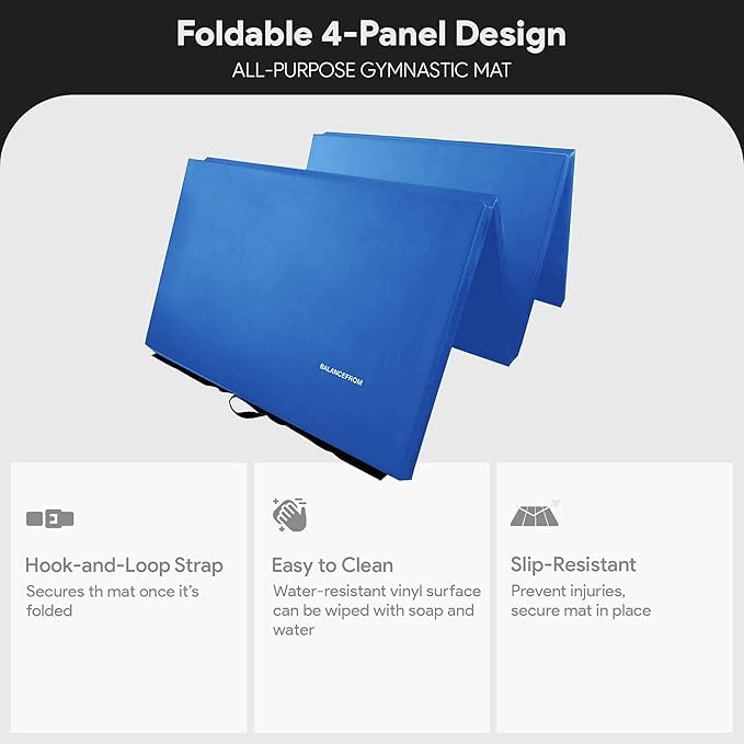• Versatile Exercise Mat: Blue 4-panel 6 ft. x 4 ft. x 2 in. folding mat for gymnastics, yoga, Pilates, aerobics, martial arts and more; offering a safer, cushioned surface for a variety of workouts