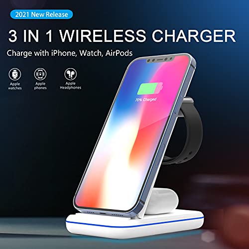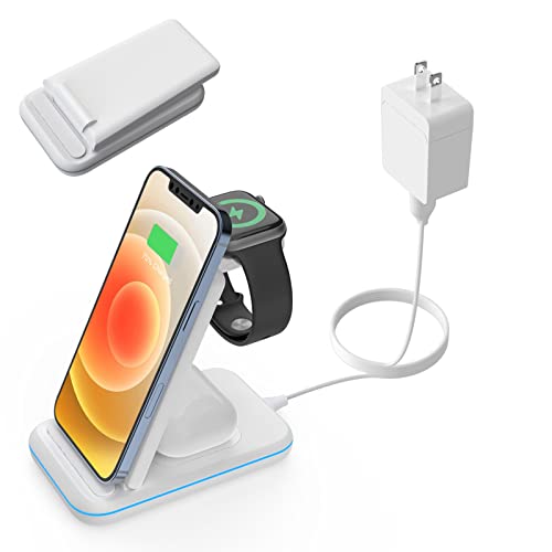 Lemon Smart Mall - حامل شحن لاسلكي قابل للطي بتصميم 3 في 1، قاعدة شاحن لاسكي بتقنية كيو اي لساعة ابل SE 6 5 4 3 2 وسماعات ايربودز 2/ برو وايفون 12/12 برو/ 11/11 برو/ x/Xr/Xs/ 8 بلس باعتماد كيو اي للشحن اللاسلكي، أبيض
