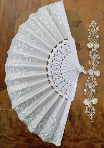 Generic - Folding Hand Fan + Hairpiece for Hair Classic Chinese/Spanish Style Wedding Party Gift for Performance, Dance, Home Decorations, Festivals (White, Small)