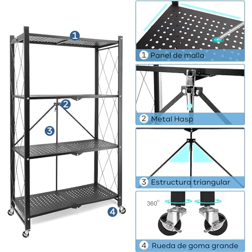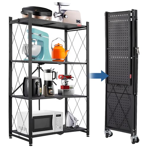 RAMSPIT - Folding Rack, 4 Tier Storage Rack with Wheels, Large Capacity Folding Metal Shelf, Durable and Non-Rust, for Garage, Kitchen, Supports up to 450 LBS (Black)