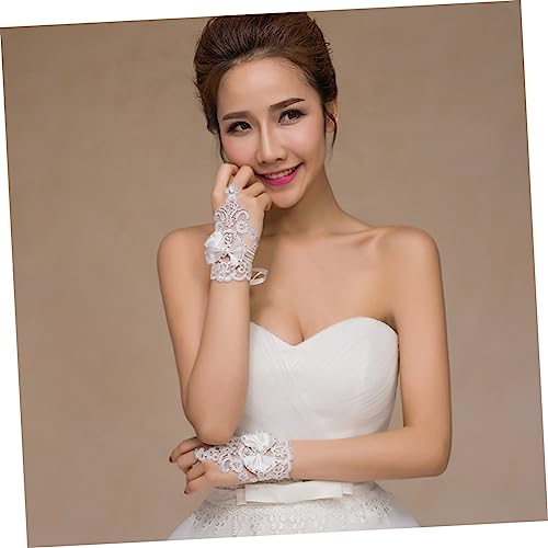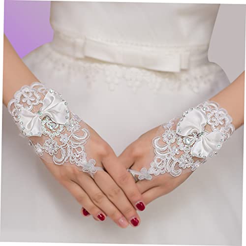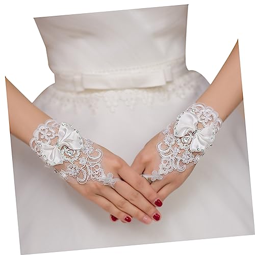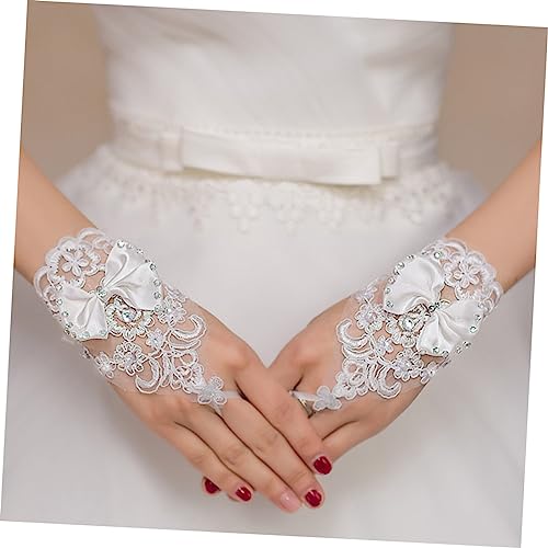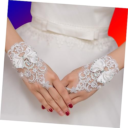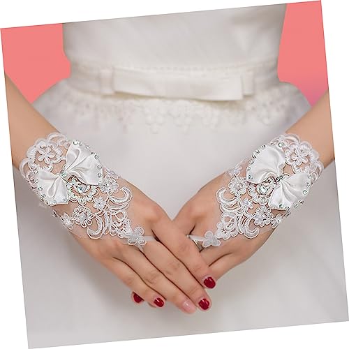 FOMIYES - FOMIYES 1pair Elegant Flower Lace Fingerless Wedding Gloves for Brides Stretchy Dress Gloves Bowknot and Rhinestone Decoration for Parties Dances and Formal Events White
