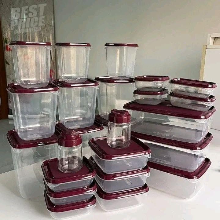 - طقم تخزين متكامل: يتضمن 24 قطعة من حاويات التخزين الشفافة بأحجام متنوعة مع أغطية محكمة الإغلاق باللون العنابي