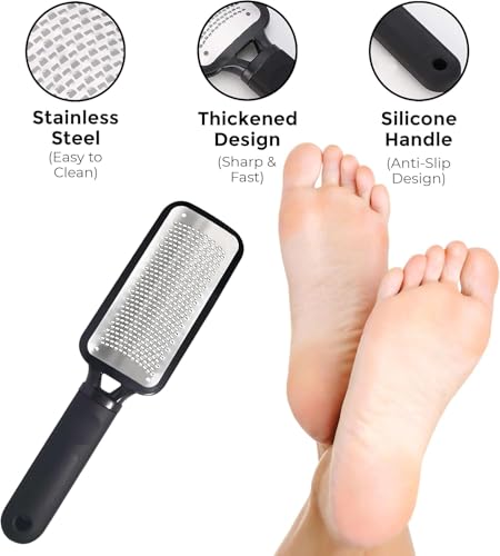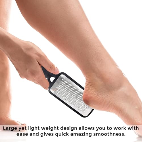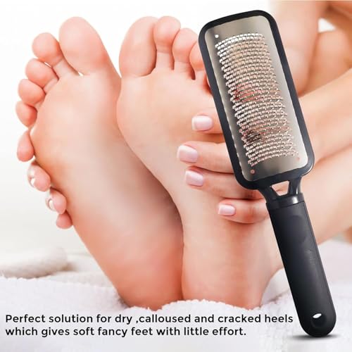 - STAINLESS STEEL FOOT FILE - The high quality stainless steel foot file and callus remover has a sharp edge flat surface. The unique design of our foot file callus remover removes the dead skin and foot callus from your foot and hardened skin.