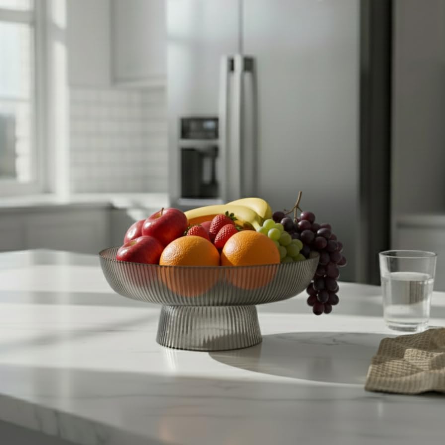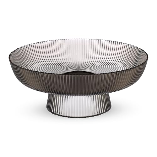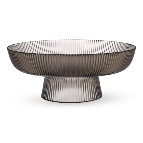 - ELEGANT DESIGN: Sophisticated smoky grey glass bowl featuring distinctive linear pattern and contemporary pedestal base for elevated presentation