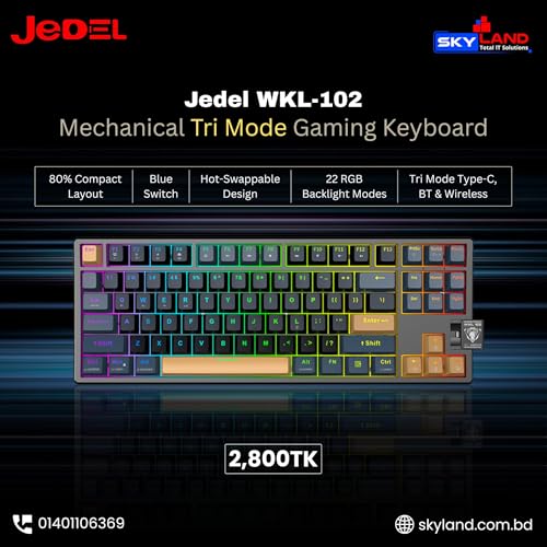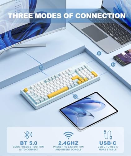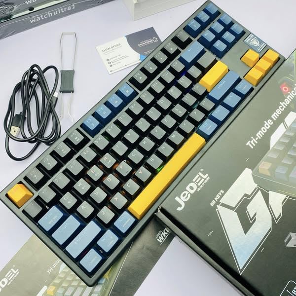 Generic - لوحة مفاتيح ألعاب جيديل ميكانيكية قابلة لإعادة الشحن بـ3 أوضاع، تي كيه ال وبلوتوث 5.3 ولاسلكي 2.4Ghz وسلكي مع مفاتيح زرقاء سريعة التبديل وإضاءة خلفية بألوان قوس قزح وبطارية 4000mAh ومفتاح AR/EN 88