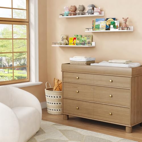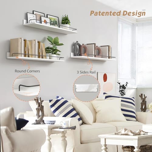 - Premium Material & Guard Rail Design - Forbena bathroom shelves wall mounted are made of high-quality painted solid wood with wood texture feature (Dimension: 24"L x 6"D x 2.2" H). The sturdy metal rail around that prevents anything from falling. The floating shelves for wall is durable enough to bear capacity strong up to 18 lbs.