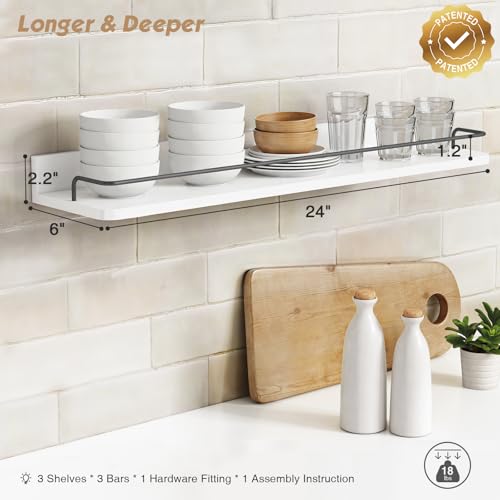 - Use Every Bit of Wall Space - Installing 24 inch floating shelves (Size: 24"L x 6"D x 2.2"H) set of 3 can help you add both storage space and stylish to your bathroom, bedroom, closet, Kitchen etc., and they don't need to take up a single square foot. Forbena Floating shelves with lip can hold everything from daily essentials like skincare serums and washcloths to decorative items like indoor plants, fresh flowers or framed artwork.