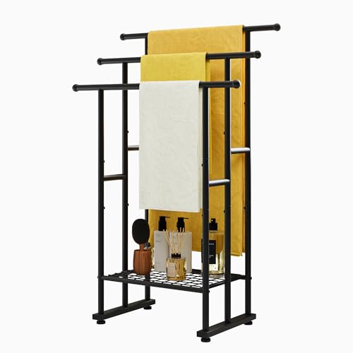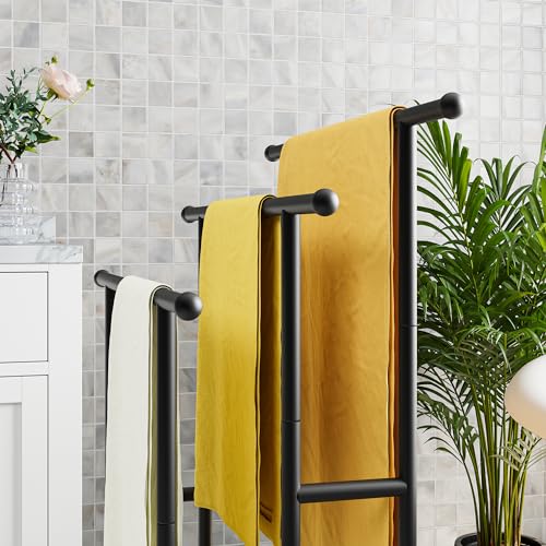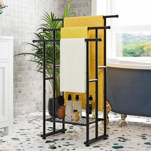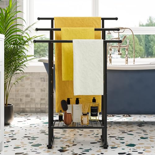 - حامل الفوط المستقل: يتيح لك هذا الحامل وضعه بحرية في أي زاوية من الحمام أو ركن في المطبخ. الأبعاد: الارتفاع x العرض x العمق تقريبًا. 102 × 67 × 31.5 سم، مع 3 قضبان للفوطة، يُعد مثاليًا للعائلة بأكملها، أو كطريقة جذابة لتخزين الفوط.