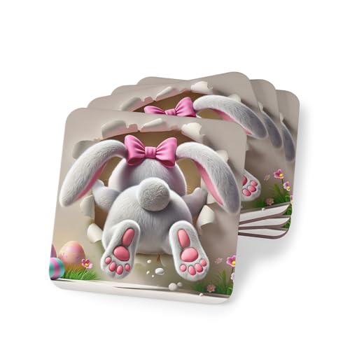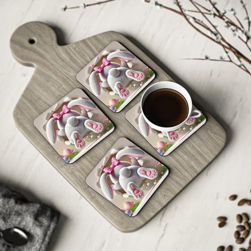 Generic - Four Pieces Adorable Long-Eared Bunny with Pink Bow Coaster Set - Holiday Decor for Mugs & Cups – Elegant, Heat-Resistant & Waterproof Drink Rubber Coasters