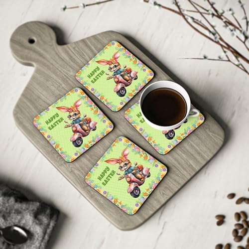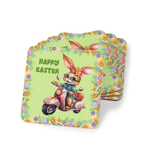 Generic - Four Pieces Cool Hipster Easter Bunny on Scooter Coaster Set - Happy Easter – Elegant, Heat-Resistant & Waterproof Drink Wood Coasters