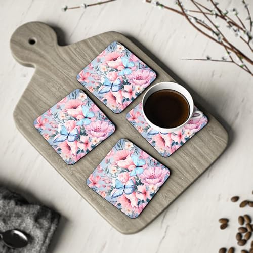 Generic - Four Pieces Pastel Pink Floral Coasters Set - Holiday Decor for Mugs & Cups – Elegant, Heat-Resistant & Waterproof Drink Wood Coasters, Coaster-297