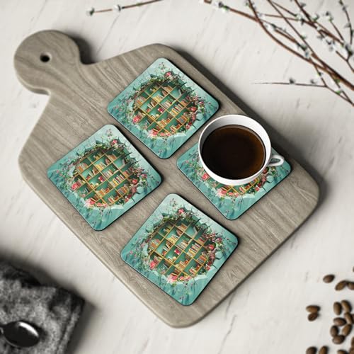 Generic - Four Pieces Secret Library Vintage Floral Wallpaper & Bookshelf Coasters Set - Holiday Decor for Mugs & Cups – Elegant, Heat-Resistant & Waterproof Drink Rubber Coasters, Coaster-296