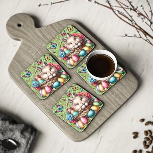 Generic - 4 قطع من قواعد الاكواب المزخرفة بتصميم ارنب الربيع الزمردي المتلألئ - قواعد اكواب خشبية انيقة ومقاومة للحرارة ومقاومة للماء