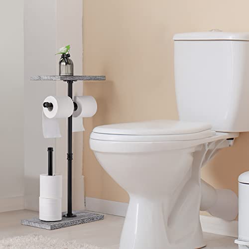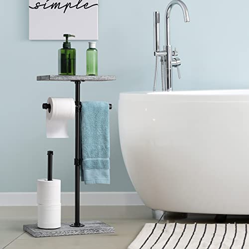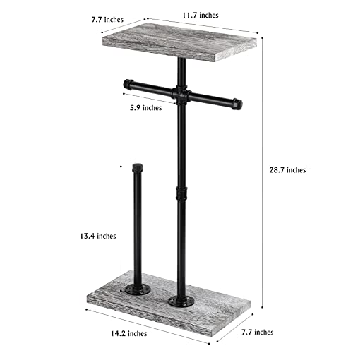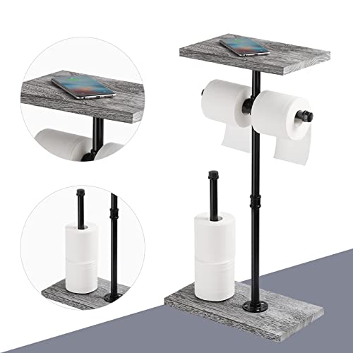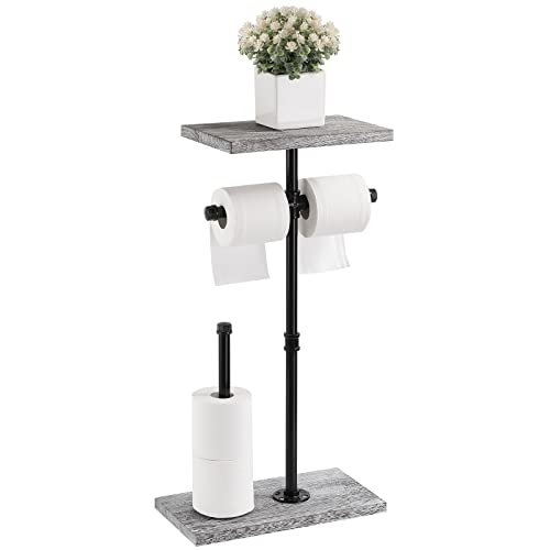 YBING - Free Standing Toilet Paper Holder, Tissue Paper Holder Stand with Wood Shelf and Industrial Pipe Floor Toilte Paper Roll Dispenser Reserve for Farmhouse Bathroom Washroom Rustic Gray