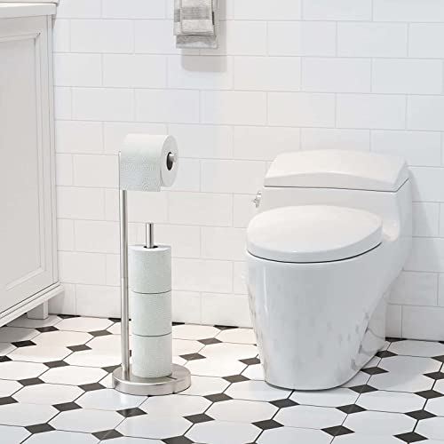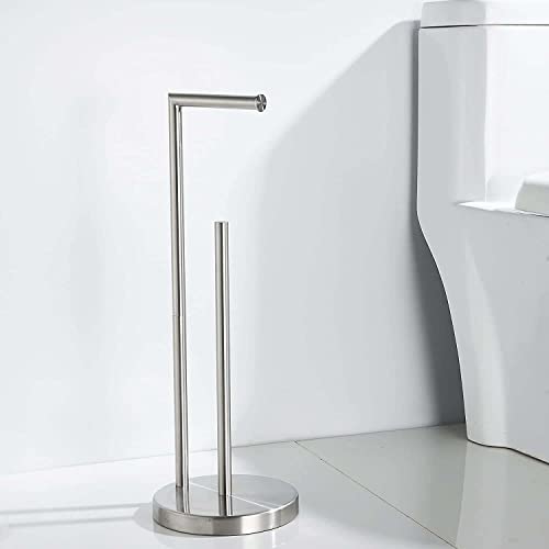 KWQKEM - حامل مناديل تواليت قائم بذاته لتخزين ورق التواليت بتصميم أرضي مزود بقاعدة ثقيلة لضمان الثبات مصنوع من الفولاذ المقاوم للصدأ لحمل لفات المناديل بشكل أنيق ومنظم، لون فضي