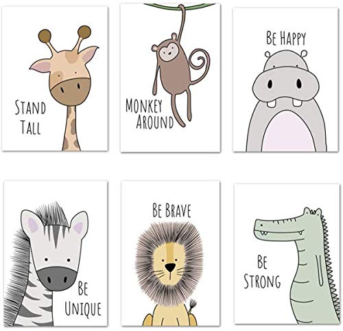 - ◆Perfect Baby Animal Wall Art: This set of 6 prints featuring lovely animals( giraffes, monkey, hippos, zebras, lions, Crocodile) and inspirational sayings, these baby animals wall artwork is not only lovely decoration of nursery decor but also a great learning tool for children.