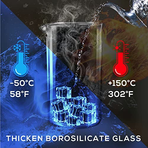 - Borosilicate Glass【Made of Reliable Material】Glass that is too thin or cheaply made would let out the heat almost instantly, which would affect the taste of your coffee. Our carafe, however, is made of heat-resistant borosilicate glass which keeps the water hot during the brewing process. Also, the thickened glass bottom tremendously extends the product service life and our handle is secured with a stainless-steel frame to keep the beaker from falling out.