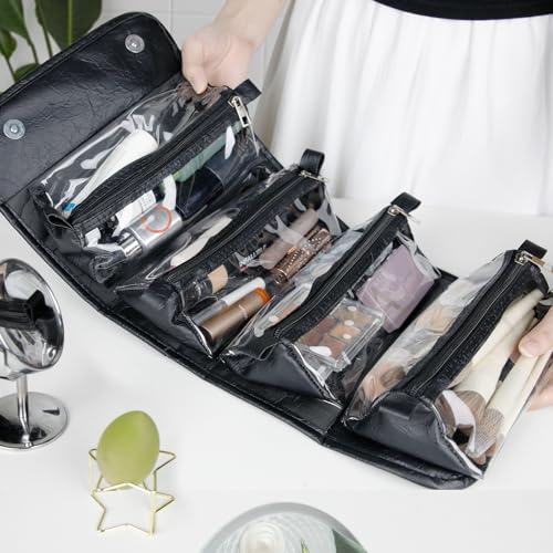 Frgyee - Cosmetic Bag, Portable Detachable Make Up Bag for Women, PU Leather Foldable Toiletry Bag with 4 Small Cosmetic Bag(Black)