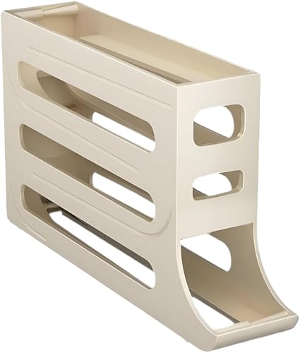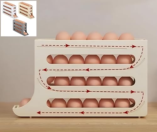 - Featuring a four-layer egg storage rack, this egg holder eliminates the hassle of cumbersome lid-pulling. Its automatic sliding egg storage box is designed with a 7° sloped angle, allowing eggs to roll down effortlessly and fill any gaps. This thoughtful design not only enhances accessibility but also ensures that your eggs are always organized and easy to retrieve, streamlining your kitchen experience.