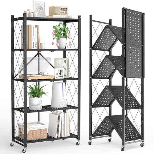 FRSTONE - FRSTONE Folding Rack, Steel Rack, Storage Shelf, Metal Rack, 5 Tier with Casters, Folding Open Rack, Shelf, Compact, Kitchen, Stove Stand, Bookcase, Easy to Move, Cupboard, Rustproof, Easy to Clean