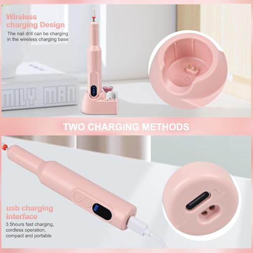 - 【Wireless charging】: Electric nail file adopts wireless base charging and in-line TYPE-C charging. It can be used for 4 hours after being fully charged, and it can also work under charging state. The wireless charging base has 8 jacks, which can be inserted into Drill bit, more convenient to use.