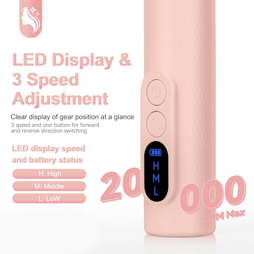 - 【Adjustable speed and direction】: The cordless nail drill has LED screen display, 3-speed speed adjustment(Max 20,000RPM), adjustable forward and reverse directions, which can easily sand, engrave, cut, polish, remove gel polish and cuticles Layer, suitable for beginner/professional manicurist/salon use/home use.