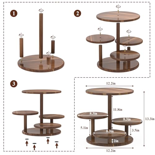 - Easy to Assemble and Disassemble: This cupcake display stand includes 5 acacia wood boards, 5 acacia wood poles, 12 face rings, 8 screws and an instruction booklet. It is designed to be very sturdy and can be easily assembled by following the steps in the video or instructions, and can be easily disassembled for compact storage when not in use.