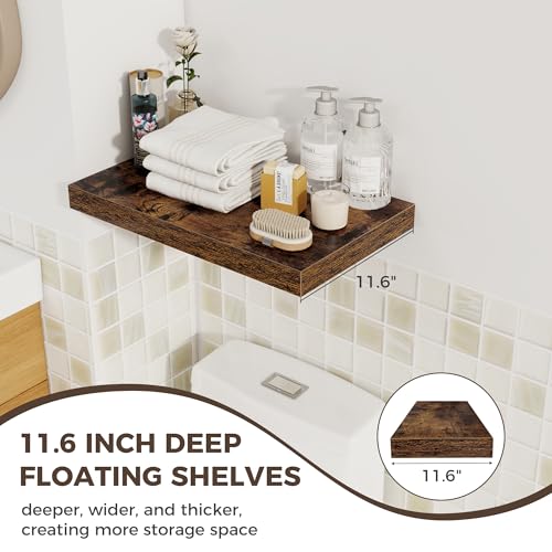- 【Save Space: 12-Inch Deep Design】Maximize your space with this 3-piece set of versatile floating shelves in a clean rustic brown finish. The 19.7x12-inch design with a substantial 1.5-inch thickness makes them perfect storage shelves for any room. Use these rustic brown wood wall shelves in the kitchen for spices, in the bathroom for toiletries, or in the living room as a display shelf for photos and decor.