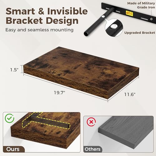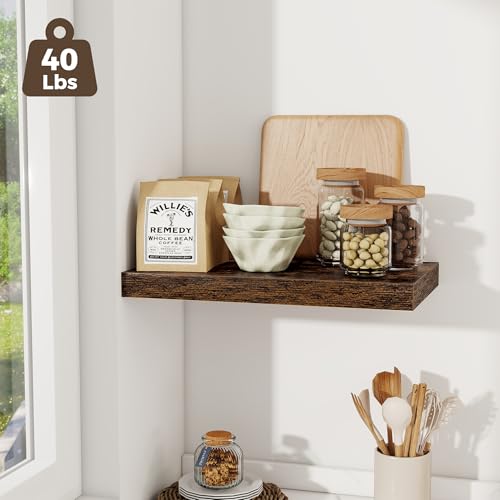 - 【Strong & Invisible Support】These sturdy wood wall shelves feature hidden brackets with a 40 lbs weight capacity. The 1.5-inch thick construction and crisp rustic brown finish maintain a clean aesthetic while offering reliable support. Use them as storage shelves for cookbooks in the kitchen, or as a secure display shelf for collectibles in your office.