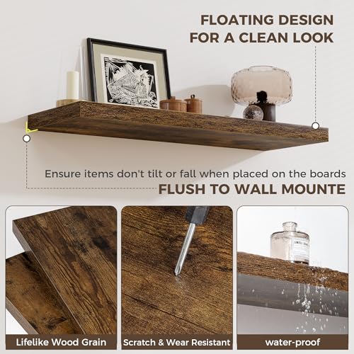 - 【Effortless 5-Minute Setup】Installing these rustic brown wall shelves is quick and simple. Everything needed is included to mount these floating shelves for wall in minutes. Easily create an elegant display shelf in your office or a practical storage solution in your bedroom with minimal effort.