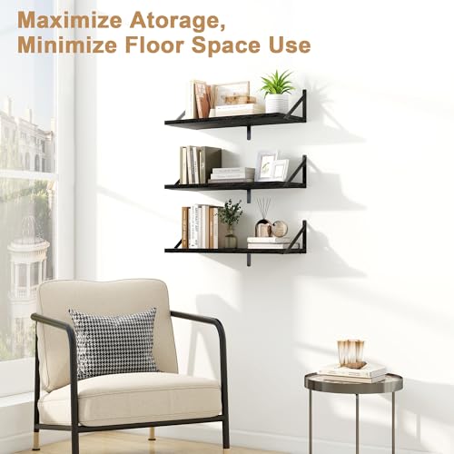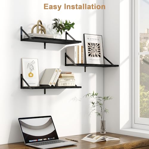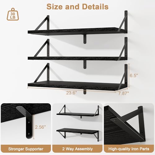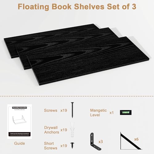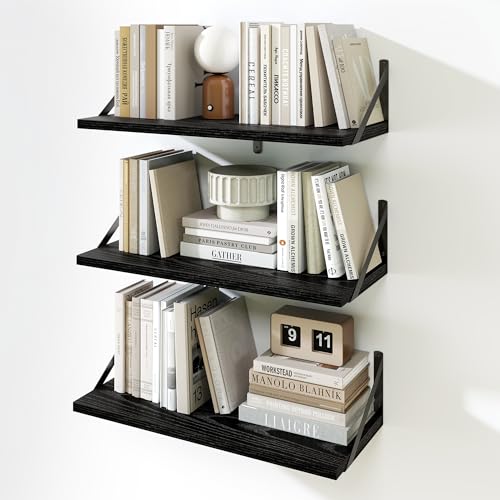 Fun Memories - Fun Memories Floating Bookshelves, Set of 3 Wall-Mounted Wood Shelves 24" W x 8" D, Decorative Wall Shelf for Living Room, Bedroom, Bathroom, and Laundry Room (Black)